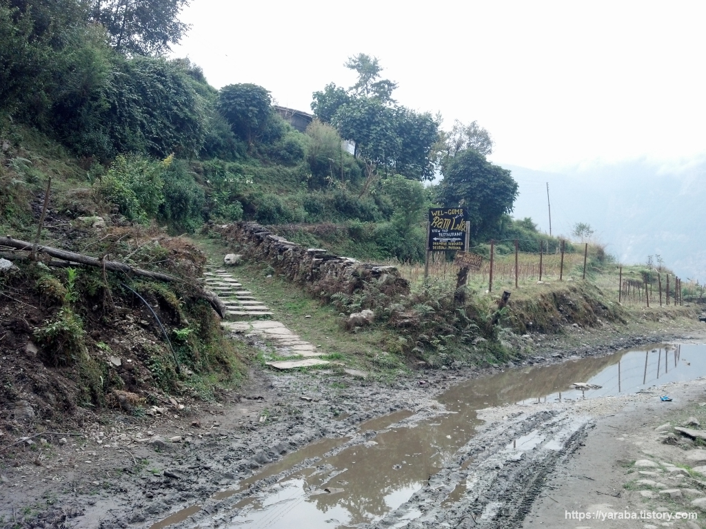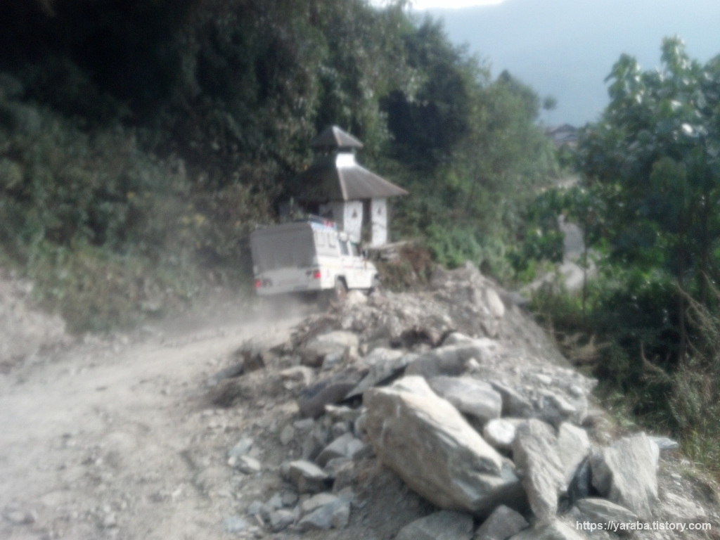 길가에 세워진 작은 사원 앞을 지프 한대가 흙먼지를 일으키며 지나가고 있습니다. 산티아고 순례길에서는 "비씨클레타"하는 소리에 사이클을 피하면 되고, ABC 트레킹에서는 가끔씩 지나가는 당나귀나 큰 짐을 이고 가는 포터를 피하면 되지만 란드룩 이후에는 지프를 피해야 합니다.