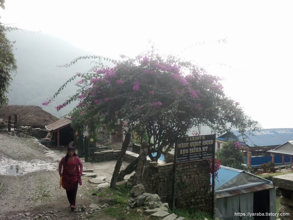 히말라야 산중에서 마지막으로 묵은 나마스떼 투어리스트 게스트 하우스(Namaste Tourist Guest House)입니다. 지도에는 호텔 나마스떼라고 적혀 있더군요. 길가에 있는 쉼터에 잠시 배낭을 내려놓고 어떤 산장으로 가야 하나 잠시 고민했습니다. 입구에는 보랏빛 꽃이 만발하고 있었고 정원은 화려했습니다. 표지판에도 이 근처에서 가장 아름다운 정원을 가지고 있다고 자랑하고 있었습니다. 조금 비쌀 것 같은데 하는 생각도 있었지만 오늘 하루 걸은 양도 많고 오후 3시 정도이니 쉬어 갈만 하기도 했습니다. 실제로 숙박비도 음식도 비싼 가격은 아니었습니다. 나름 만족한 숙소였습니다.