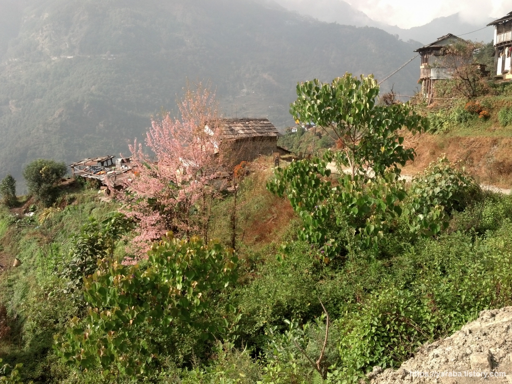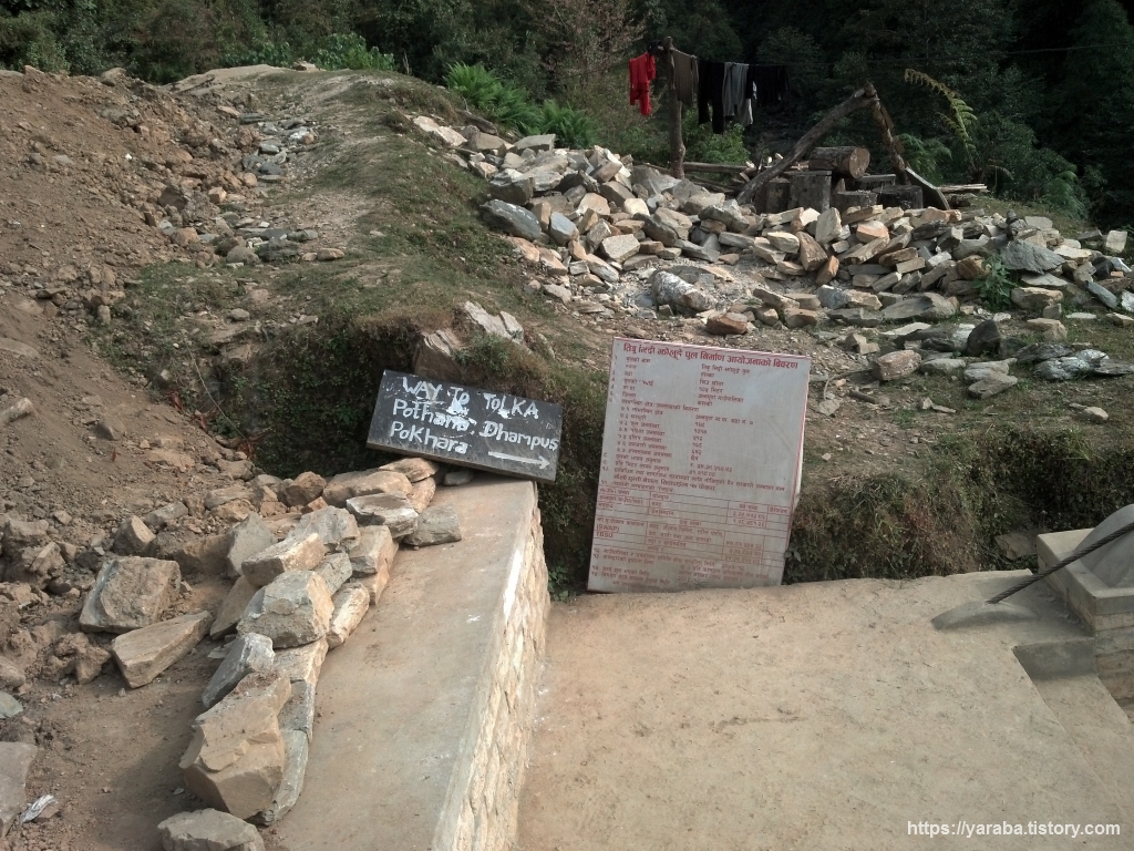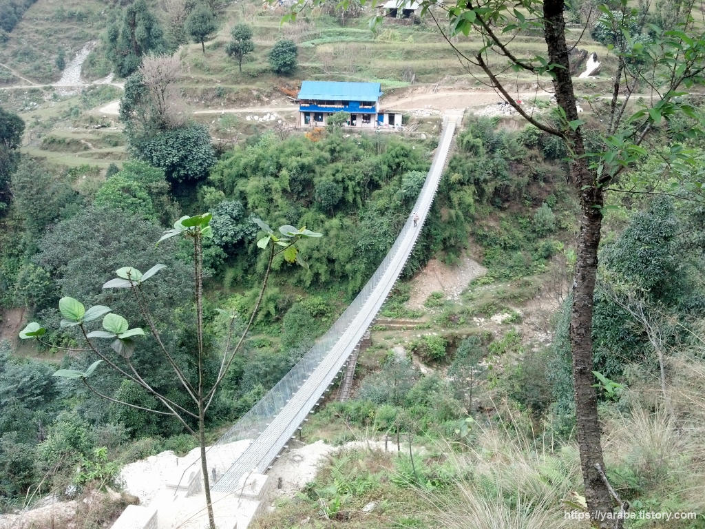 톨카 마을에 올라서서 바라본 안나푸르나 쪽 풍경과 저희가 건너온 출렁다리의 모습입니다. 저희가 여러 산장이 모여있는 톨카(Tolka)에 도착한 시간은 오후 2시가 조금 넘어가는 시각이었는데 막상 이곳에 도착하니 숙소 잡기가 쉽지 않았습니다. 와이파이도 되고 핫 샤워도 된다며 우리 집으로 들어오라는 아주머니의 호객 행위도 있었지만 마음에 내키지가 않았습니다. 무엇보다 옆지기의 마음에 드는 산장이 없었습니다. 시간도 조금 이르고 길을 따라서 드문 드문 산장이 이어지니 조금 걸어보기로 했습니다.