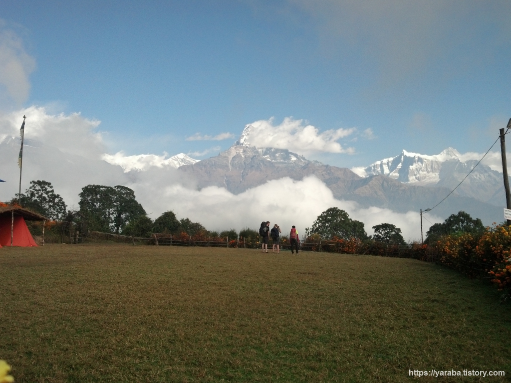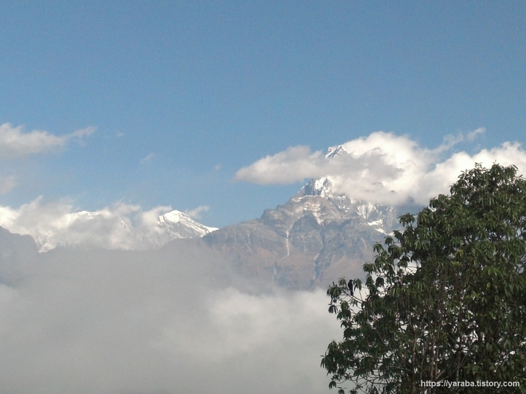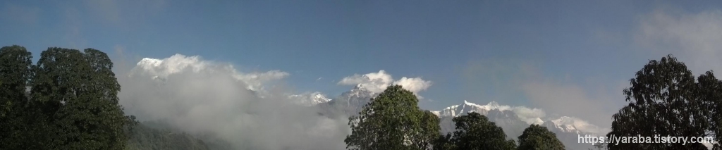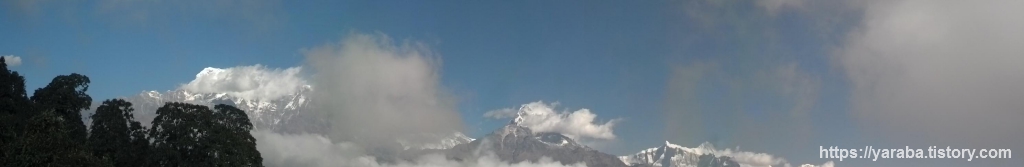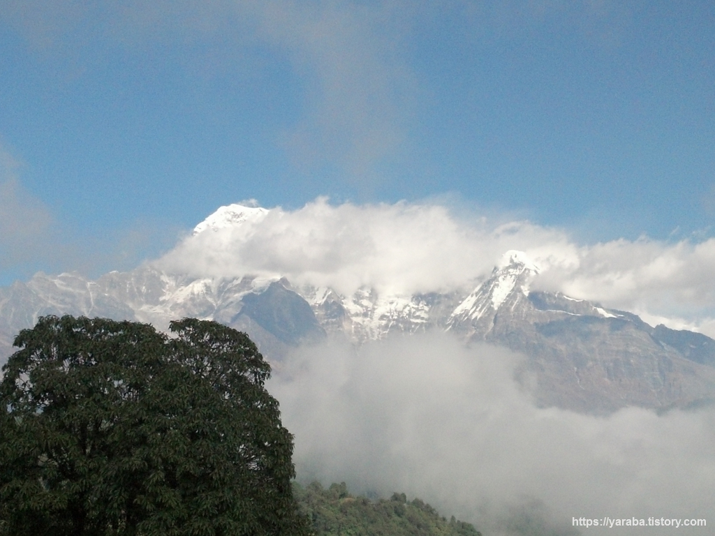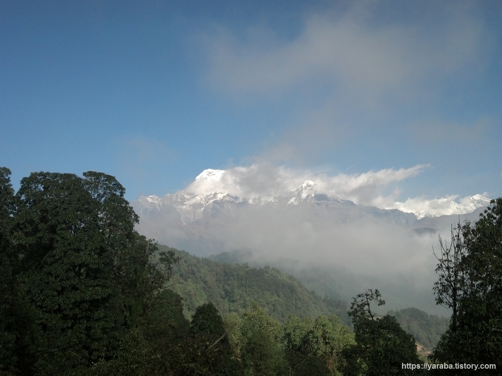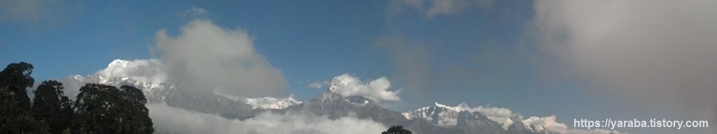탁 트인 공간에서 바라보는 안나푸르나 산군의 모습도 일품입니다. 오전 11시가 조금 넘어가는 시간인데 맑은 하늘에 흰구름들이 계곡을 따라 쌓이기 시작합니다.