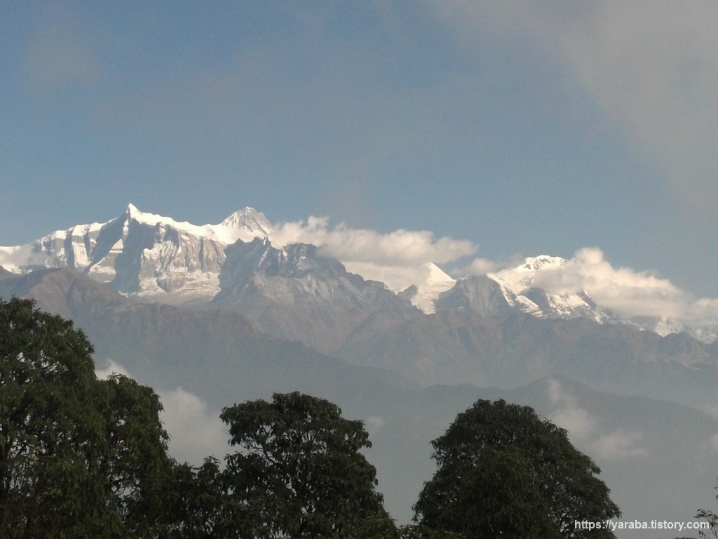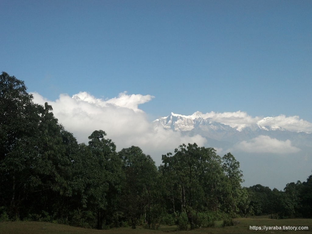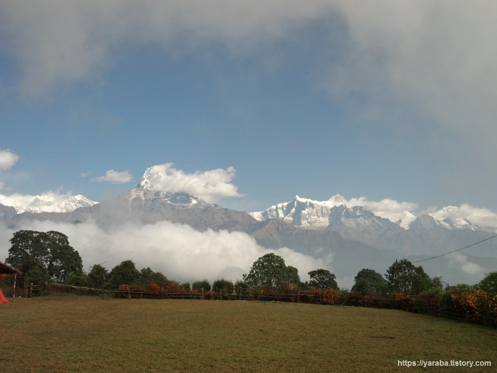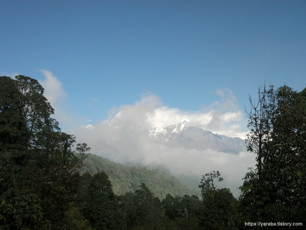 탁 트인 공간에서 바라보는 안나푸르나 산군의 모습도 일품입니다. 오전 11시가 조금 넘어가는 시간인데 맑은 하늘에 흰구름들이 계곡을 따라 쌓이기 시작합니다.