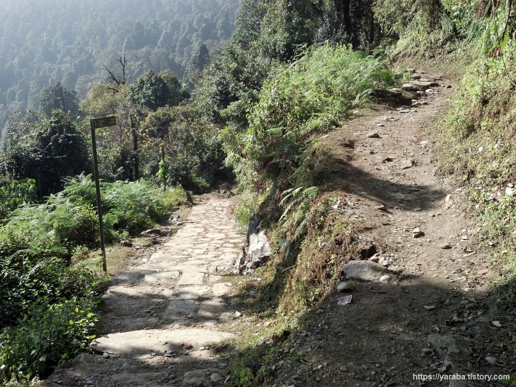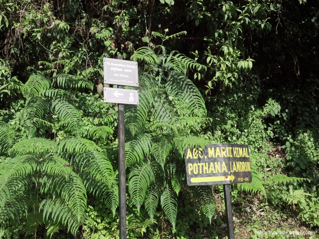 오스트레일리안 캠프를 떠난 저희는 돌길을 따라 담푸스로 향하는 길로 내려갔습니다. 숲 속이라 길 위에 돌바닥이 미끌미끌할 정도라서 내려가는 길을 조심조심 걸을 수밖에 없었습니다. 포타나 쪽에서 오는 길과 합류하는 지점에 세워진 ABC 트레킹 경로 안내판과 포타나 및 란드룩으로 향하는 표지판입니다.