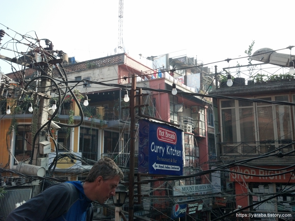 빵집 2층에서 바라본 골목 풍경. 전깃줄이 서로 얽혀 있고 밤이면 운치를 더할 백열전구들이 매달려 있지만 이것 또한 이곳 나름의 풍경이 아닐까 싶다. 넉넉한 아침을 먹었으니 이제 본격적인 카트만두 시내 걷기에 나서 본다.