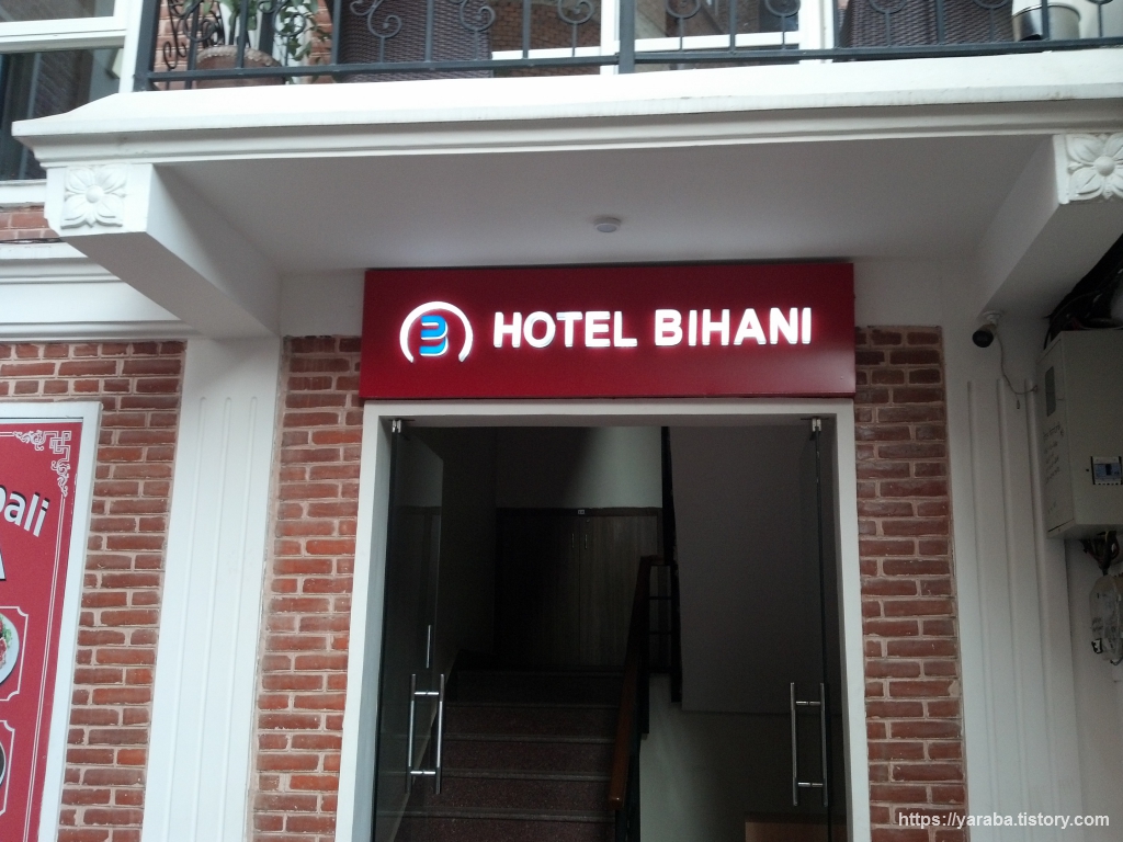 정해 놓은 숙소가 없으니 골목길에서 보이는 숙소 중에 깔끔하고 비싸지 않은 숙소가 있기를 바랄 뿐이었다. 새벽 5시를 바라보는 시각 어두컴컴한 타멜(Tahmel) 골목은 지난밤의 화려한 여흥이 가시지 않은듯 고요한 가운데서도 조금은 들뜬 분위기가 아닌가 싶었다. 혹시나 당할지 모르지 범죄에 대한 염려로 중요 물품은 배낭 깊은 곳에 넣어 두었지만 긴장감 없이 컴컴한 골목을 걸을 수는 없었다. 그러다가 우연하게 만난 숙소가 호텔 비하니(Hotel Bihani)였다. 경비원 아저씨가 닫혀 있던 대문을 활짝 열고 계셨는데 얼리 체크인이 가능하냐고 물으니 알아 들었는지는 모르겠지만 자신을 따라오라고 한다. 그를 따라서 건물 2층으로 올라갔는데 그곳이 호텔의 체크인 카운터였다. 경비 아저씨는 알아 들었는지는 모르겠지만 카운터까지 우리를 데려다준 것이었다.