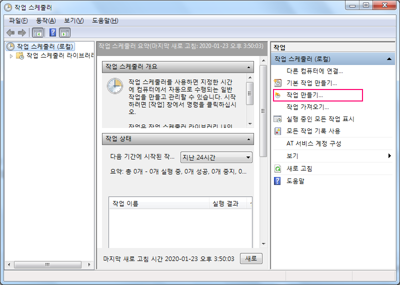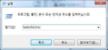 작업 스케쥴러 등록은 윈도우+R로 실행창을 띄워 taskschd.msc를 실행시키거나 "관리도구>작업 스케쥴러" 또는 "관리도구>예약 작업"으로 실행시킬 수 있습니다.