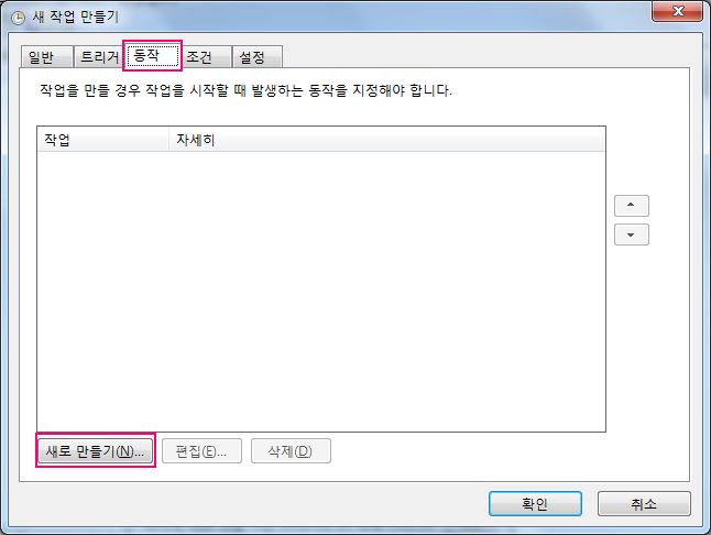끝으로 "동작" 탭에서 새로 만들기로 수행할 프로그램을 선택하면 시스템이 시작하는 시점에 관리자 권한으로 프로그램을 실행시킬 수 있습니다.