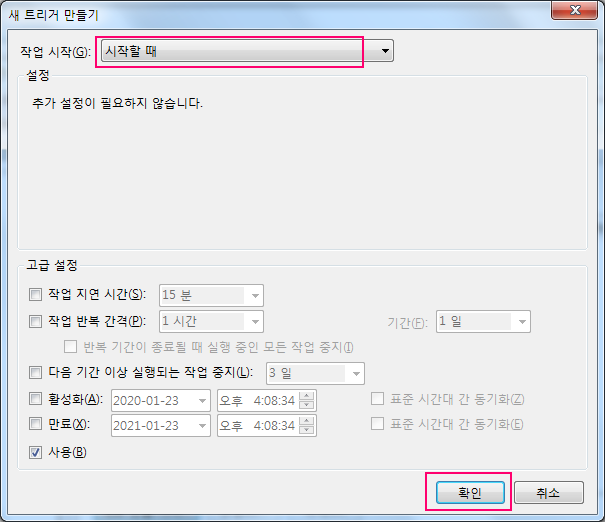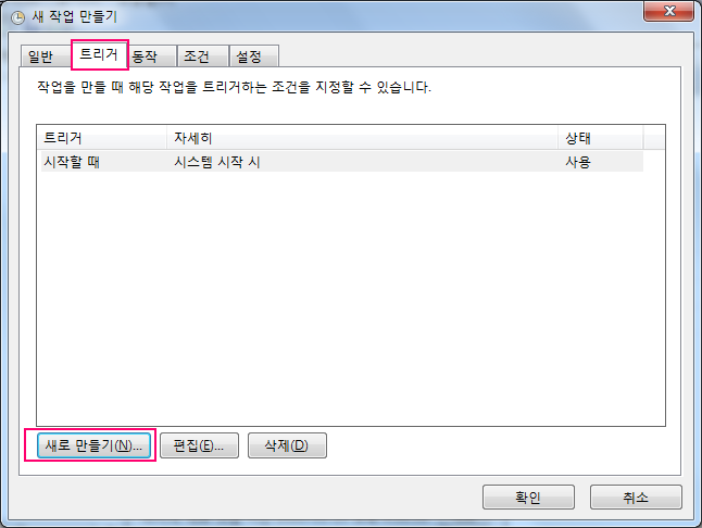 다음에는 상단의 "트리거" 탭을 선택하고 "새로 만들기"를 선택해서 새 트리거 만들기를 수행합니다. 새로운 트리거는 작업 시작 시점을 "시작할 때"로 설정합니다.