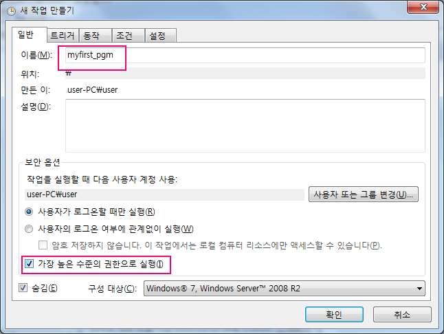 새 작업 만들기에서 중요한 부분이 이름과 함께 "가장 높은 수준의 권한으로 실행"을 선택하는 것입니다.