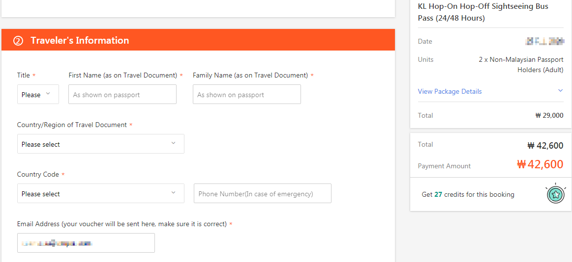 공항과 시내간 왕복을 위한 버스 예약과 시티 투어 버스 예약을 끝내면 쇼핑카트에서 일괄적으로 결제를 진행한다. 공항버스의 경우에는 비상 연락처를 입력해야 한다. 대표 여행자의 정보를 여권 기준으로 입력하고 핸드폰 번호까지 입력한 다음 카드 결제 정보를 입력하면 바로 결제를 진행할 수 있고 표시된 원화로 결제가 완료되고 메일로 각 여행 상품의 바우처가 날아온다.