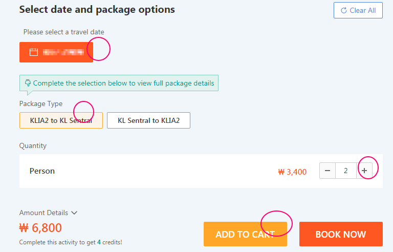 https://www.klook.com/activity/21521-shared-bus-transfer-klia-sentral-kuala-lumpur/ 사이트에서 예약을 진행했다. 예약 방법은 먼저 버스를 탈 날짜를 선택하고 공항에서 시내(KLIA2 to KL Sentral)인지 아니면 공항으로 오는 것인지 방향을 선택하면 인원수를 선택할 수 있도록 나오는데 해당 인원수를 맞추고 쇼핑 카트에 추가한다. 왕복권이 없기 때문에 공항에서 시내로 가는 것과 시내에서 공항으로 오는 예약을 따로 진행해야 한다. 시티투어 버스와 함께 예약을 여러 건 진행하므로 카트에 넣었다가 한 번에 결제한다.