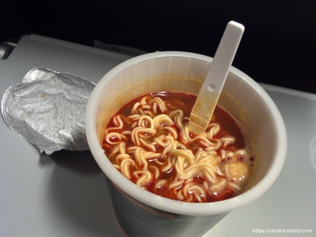 컵라면 용기는 우리나라 컵라면 같은 종이컵이 아니고 플라스틱 용기였다. 가격이 저렴한 것은 아니었지만 비행기에서 먹는 컵라면 치고 나름 먹을만했다. 시간을 거슬러 하늘을 날면 곧 새로운 땅에 발을 디디겠지!