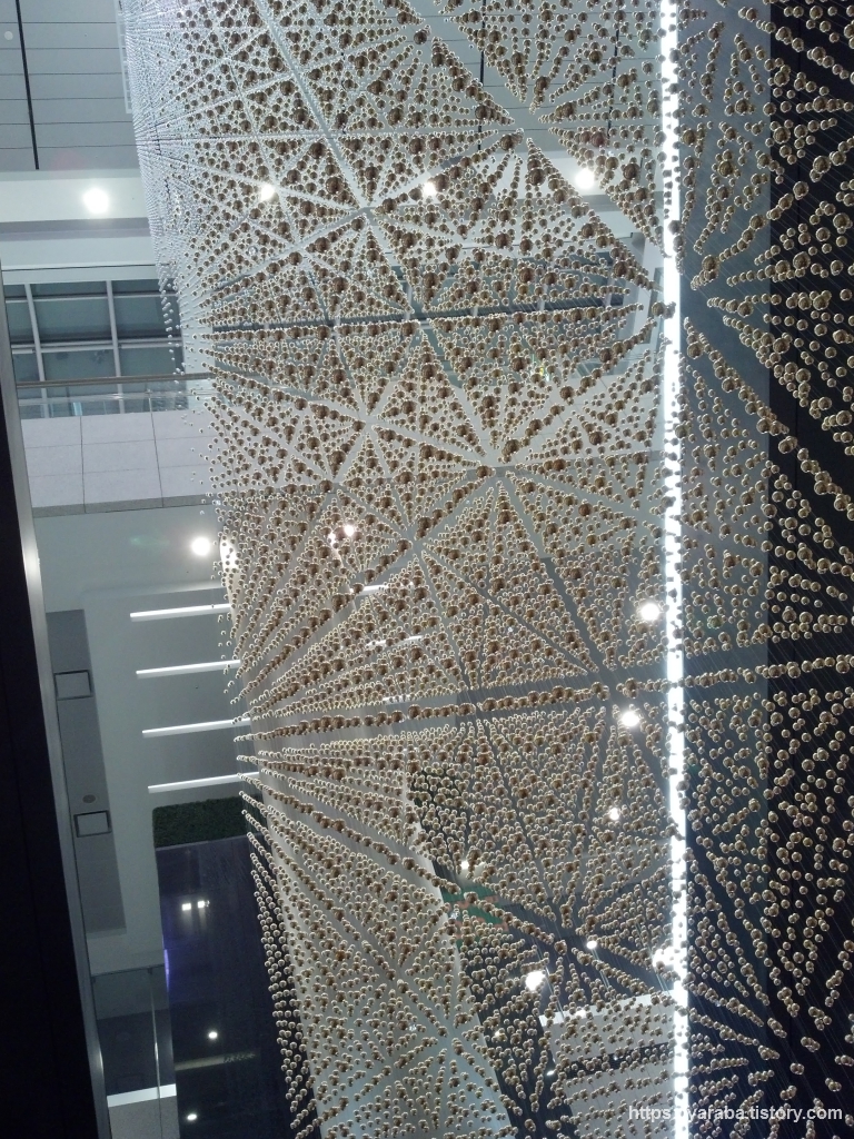 에어아시아 항공기들은 통상 탑승동에서 출발하므로 체크인이후 셔틀트레인으로 탑승구까지 이동하는데 시간이 소요될 수 있다. 늦으면 공항에서 자신의 이름이 불리는 낯 뜨거운 상황이 발생할 수 있다. 출발 시간까지 시간이 넉넉하므로 탑승동까지 이동하는데 이전에는 눈에 들어오지 않은 모습이 눈을 사로잡았다. 셔틀트레인 탑승장 위를 장식하고 있는 이름 모를 작품이다. 수많은 은색 공을 일정한 간격으로 매달아 놓았는데 보는 각도에 따라 다양한 모습을 연출했다. 그저 차량을 기다리며 앞만 보고 있으면 보이지 않을 모습이지만, 마음의 여유를 가지고 잠시 쉬며 주변을 돌아보면 동일한 공간에서도 다른 모습이 마음에 들어온다.