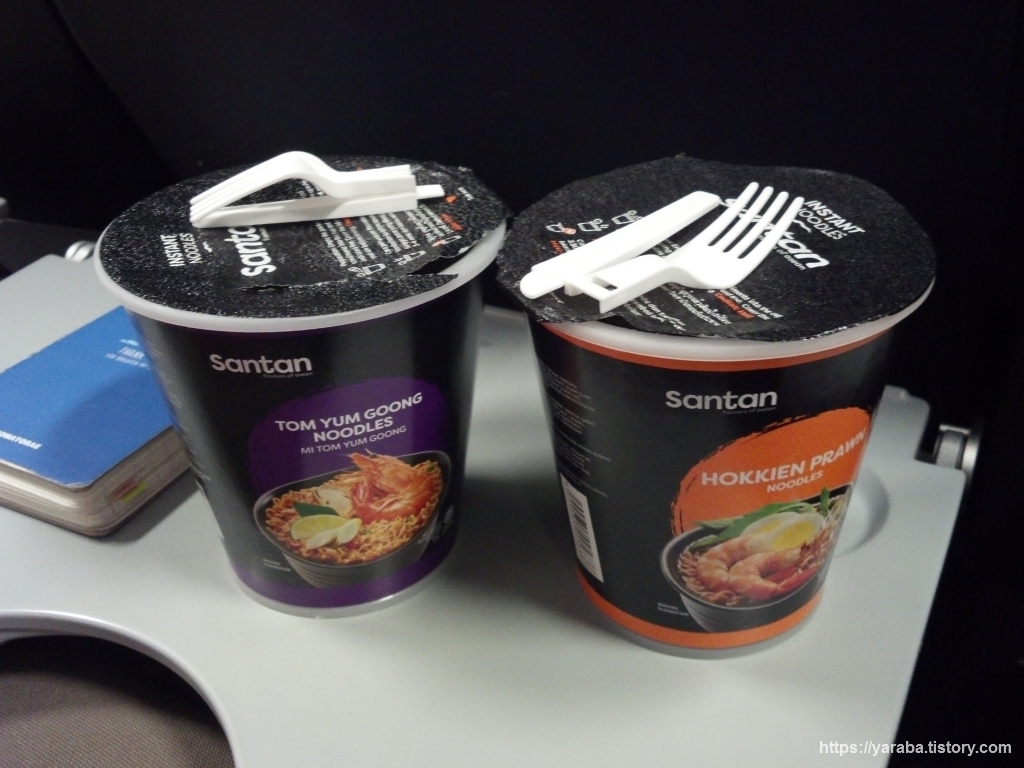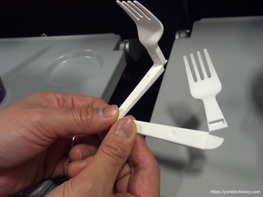 컵라면 두개에 플라스틱 포크를 받았는데 하나는 수직으로 꺾이고, 다른 하나는 옆으로 꺾이는 방식이었다. 새로운 방식의 기내식, 새로운 포크에 새로운 라면까지 흥미로움이 커지는 여행의 출발이다.