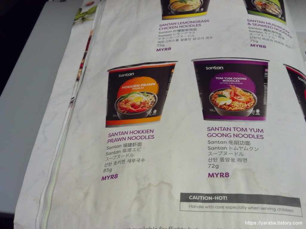에어아시아의 특징중에 하나가 기내식을 미리 주문할 수 있고, 미리 주문하지 않더라도 즉석에서 시킬 수 있다는 것이다. 일률적으로 제공하는 대신 부가 서비스로 기내식을 제공하겠다는 전략인데 밤 비행기니까 대부분 그냥 자겠지 하는 예상을 깨고 많은 고객들이 미리 기내식을 주문해서 먹었고 즉석에서 주문하는 사람도 많았다. 주변에서 풍기는 냄새는 마스크를 쓰고 눈을 감는다고 없는 것이 되지 않았다. 하는 수 없이 코에 풍기는 냄새가 라면 같아서 컵라면을 두 개 주문했다. 좌석마다 꽂혀있는 메뉴에는 말레이시아 링깃으로 가격이 적혀 있지만 달러로도 결제할 수 있고 카드 결제도 가능했다. 미리 음식을 주문한 경우에는 탑승권을 보여주면 좌석 번호에 해당하는 음식을 전달해 주는 방식이다.