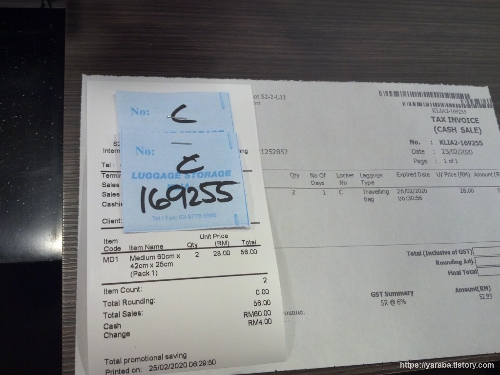 필자의 경우 중형 크기(60 X 42 X 25) 두개를 하나당 28링깃으로 맡겼다. 여권을 제시해야 한다.