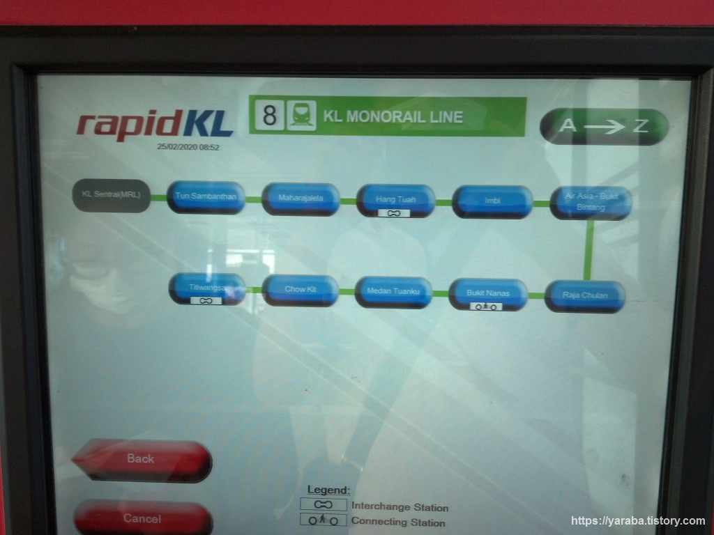 KL 센트랄 모노레일 역에 도착하면 자판기에서 티켓을 구매해야 하는데 우선 좌측 상단에 있는 [English]를 클릭해서 영어로 메뉴를 바꾸고 가운데 있는 모노레일 라인을 선택한다.