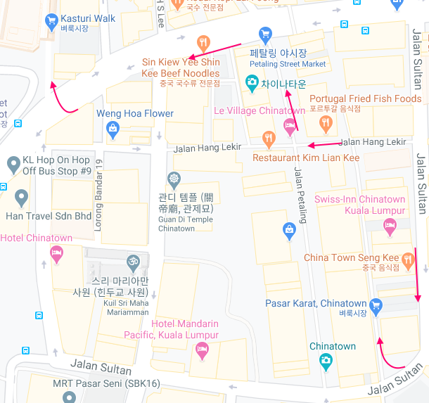 위의 지도는 레드라인을 돌고 나서 레드라인의 마지막 정류장인 차이나타운에서 센트럴 마켓으로 가는 경로인데 이 경로를 거꾸로 올라가기로 했다. 센트럴 마켓과 카스투리 워크를 다녀왔으니 차이나타운을 가로질러 레드라인 버스 정류장을 찾아 걸었다.