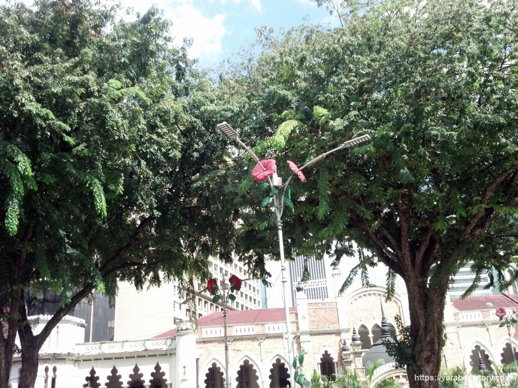 공원 지대에 들어서니 독특한 모양의 가로등이 우리를 반긴다. 바로 붕아 라야(Bunga Raya)라 부르는 말레이시아의 국화다. 붕아 라야는 "위대한 꽃"이라는 의미인데 다섯장의 빨간 꽃잎과 가운데 암술이 길게 나온 것이 특징이다. 가로등도 긴 암술과 같은 모양을 하고 있다. 히비스커스(hibiscus) 중에서도 빨간 꽃잎을 가진 부상화(Hibiscus rosa-sinensis)가 붕아 라야로 우리나라의 무궁화처럼 아욱과 무궁화속으로 말레이시아 전역에서 쉽게 발견할 수 있다고 한다. 불상화, 하와이 무궁화라고도 부른다. 훌라춤을 출 때 여인들이 장식할 때 이용하는 꽃이라 한다. 정열의 빨간색이 인상적인 꽃인데 말레이시아 국화로서 빨간색은 용기를 의미한다고 한다.