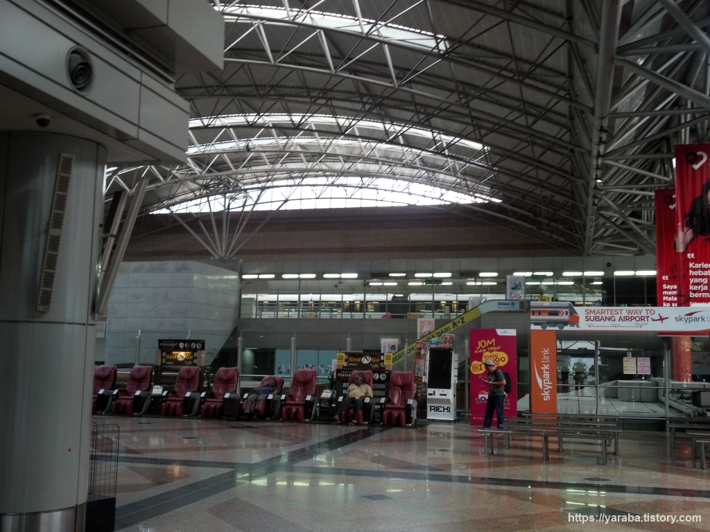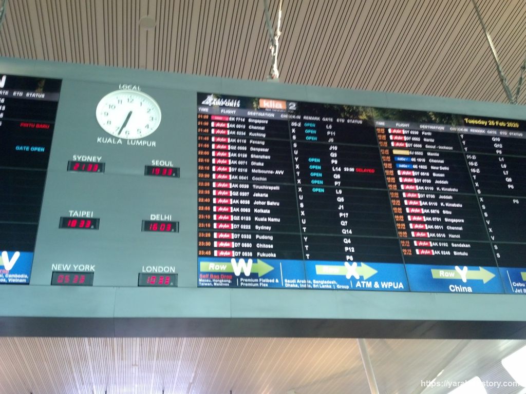 공항에 도착해서는 입국장에 위치한 짐 보관소에서 아침에 맡겨둔 짐을 찾고 바로 한층 위에 위치한 출국장으로 이동했다. 한국과 말레이시아는 거리는 조금 멀리 떨어져 있지만 시차는 1시간이다. 공항에 도착한 시간이 저녁 6시 33분 정도 였는데 서울 시간은 19시 33분을 가리키고 있다. 첸나이행 항공편의 탑승구를 확인하고 출국 수속을 밟는다. 첸나이행 환승 항공기의 탑승권은 한국에서 미리 받았으니 체크인 데스크에 다시 갈 필요는 없고 바로 출국 수속을 밟으면 된다. 쿠알라룸푸르 공항은 파리 드골 공항처럼 출국 수속 때 한번 그리고 탑승구 가기 직전에 한번 더 보안 검사를 받으므로 면세점에서 물건을 구입했다면 포장한 상태로 보안 검사를 받아야 한다. 출국 수속 후 안에 있는 상점에서 음료수를 구입했다면 다 마시고 보안 검사를 받던가 편의점에서 밀봉 포장을 해서 보안 검사를 받아야 한다. 그렇지 않으면 두 번째 보안검사에서 그냥 압수당하고 만다. 필자도 그렇게 한 모금도 마시지 못하고 빼앗겼다는......