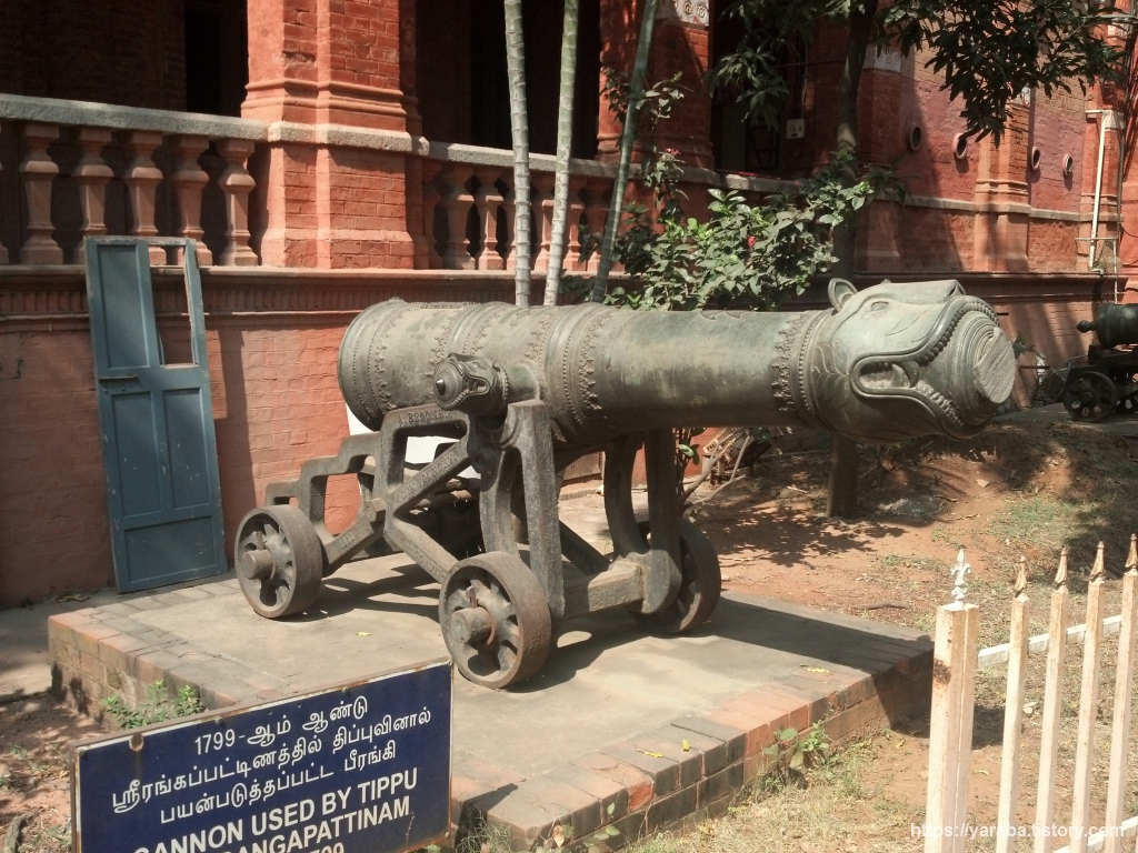1851년에 개장한 첸나이 정부 박물관은 인도의 4대 박물관 중의 하나이자 인도에서 두 번째로 오래된 박물관답게 박물관 주변은 커다란 아름드리나무들이 나무 그늘을 만들어 준다. 18세기에 사용했던 대포들도 이곳의 역사를 대변해 주고 있다. 우측에 있는 대포는 14세기부터 18세기까지 남인도를 통치했던 마이소르 왕국의 티푸(Tipu) 술탄의 군대가 사용했던 대포로 티푸의 별명이 마이소르의 호랑이(Tiger of Mysore)라고 불렸던 까닭인지 대포의 앞부분 문양이 호랑이로 새겨져 있다. 티푸가 영국과 연결된 내부 반역자에 의해 암살당하기 전까지 마이소르는 영국군을 위협하는 존재였다고 한다.