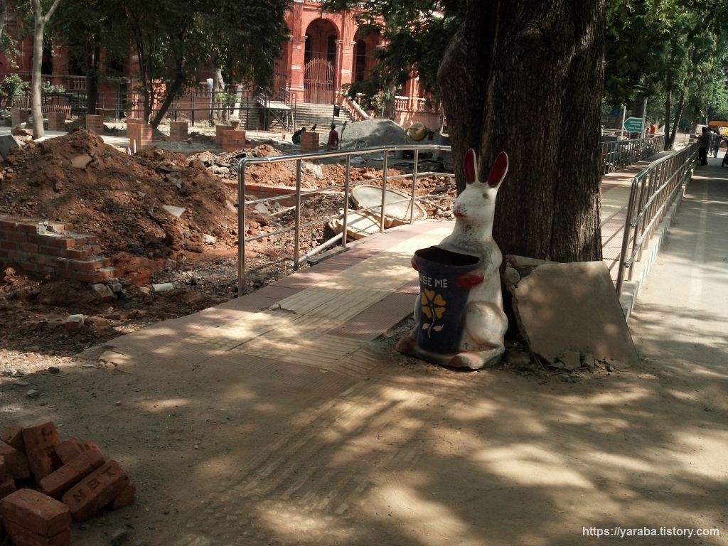 박물관 외부는 한참 공사 중이었다. 첸나이는 입주 기업들도 많아서 재정이 넉넉한 도시임에도 불구하고 사회간접자본이나 복지 시설 투자가 미흡하다는 이야기를 들었는데 박물관을 돌아다녀 보니 좋은 콘텐츠들이 너무 방치되고 있는가 아닌가? 하는 생각도 들었다. 나를 사용해 주세요!라고 외치고 있는 재미있는 휴지통과 인사로 본관으로 이동하며 박물관과의 첫 만남을 시작한다.