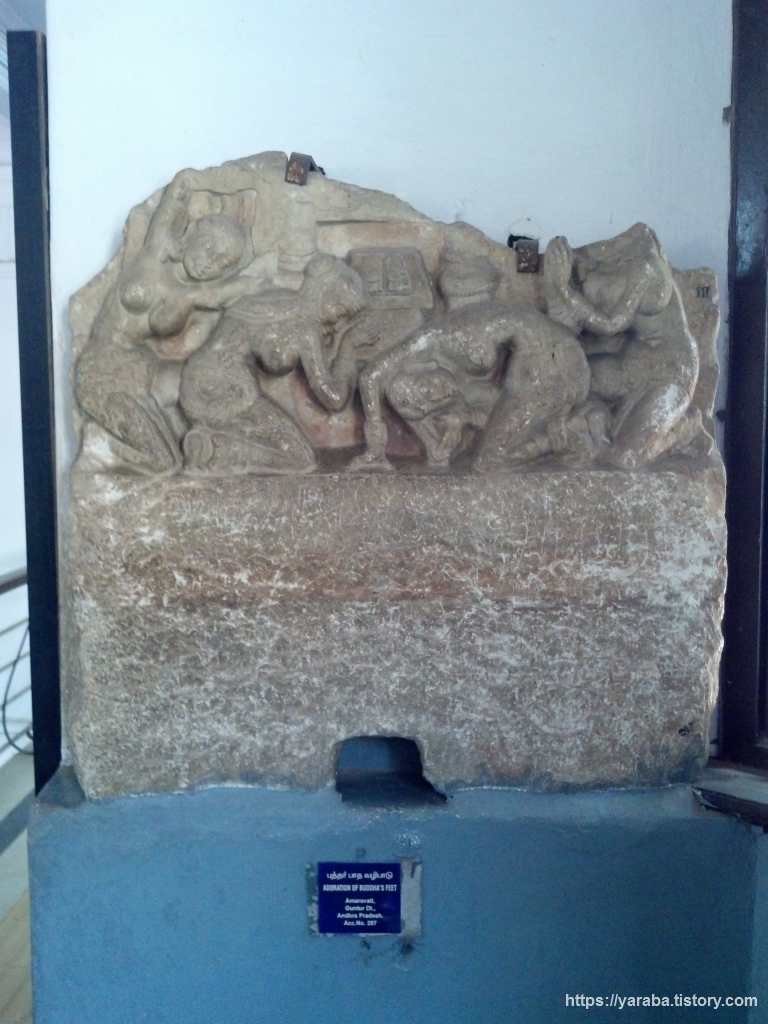 부처의 발을 경배하는 사람들의 모습을 조각한 작품. 아마라바티(Amaravathi) 지역의 유물로 관람자들이 하도 만져서 반들반들한 부분도 있고 하단은 흠집이 가득하다.