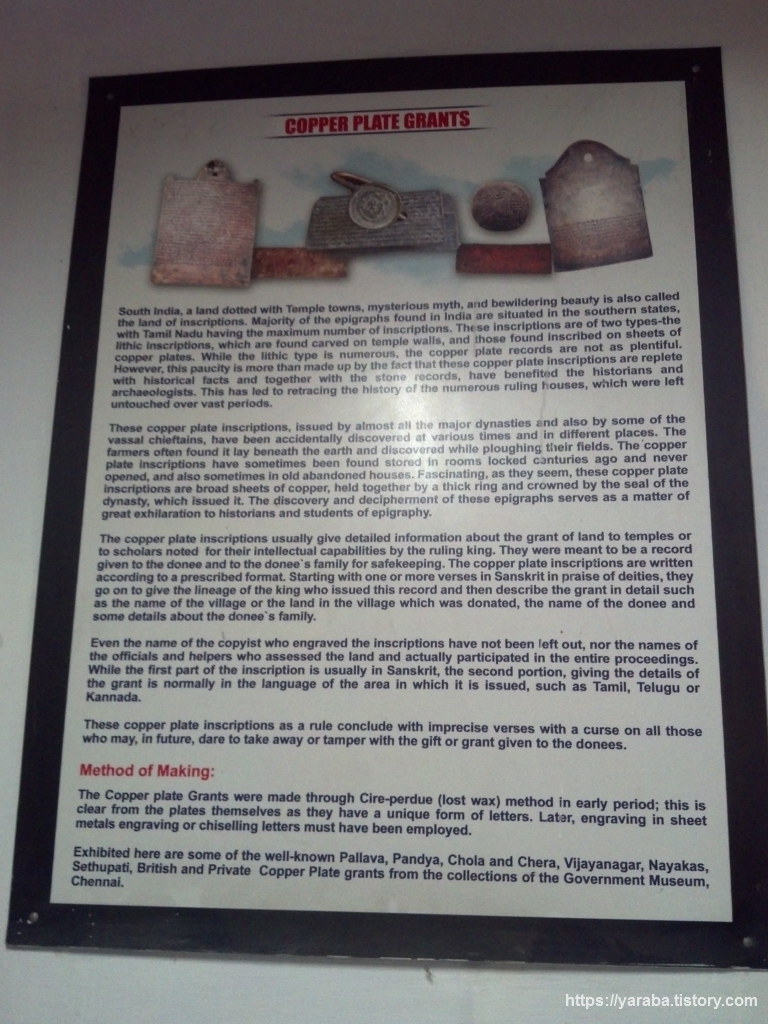 동판 문서(Copper Plates Grants) 유물들. 개인적으로는 처음 만나는 유물이었다. 스페인에서 만화 작품을 표현한 인쇄용 동판을 본 적이 있지만 문서로 사용되는 동판은 처음이었다. 인도에서는 고대로부터 정부의 공식문서 내지 부동산 권리서 등 법적 효력이 있는 공식문서를 동판에 새기는 방법으로 작성했다고 한다. 남인도를 새김 글의 땅이라고 설명하고 있는데 사원 벽에 새기는 것과 함께 동판에 남긴 유물이 많은 모양이었다.