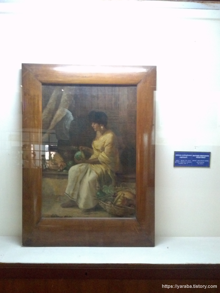 이 또한 라비 바르마의 동생 라자 바르마(C. Raja Raja Varma)의 작품으로 "야채를 다듬는 어머니, Mother preparing vegetables" 유화다.