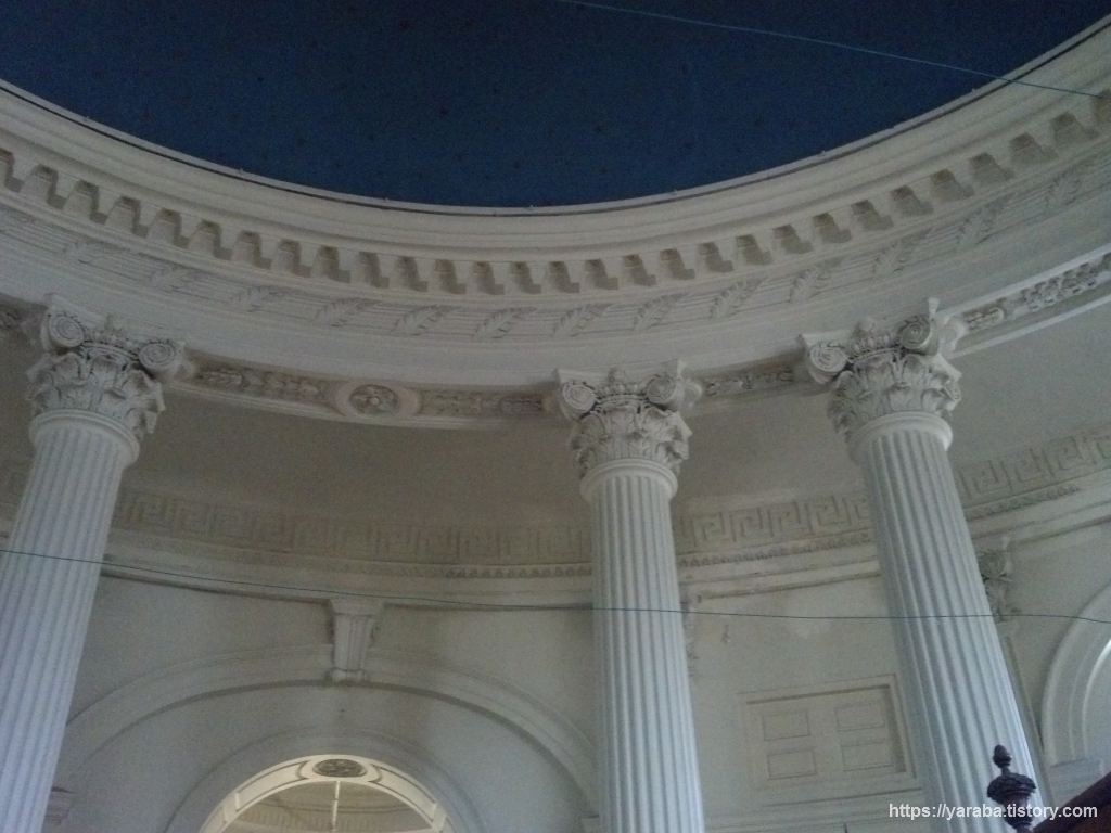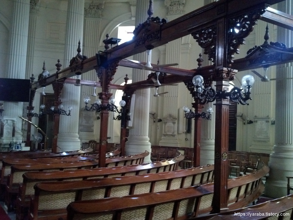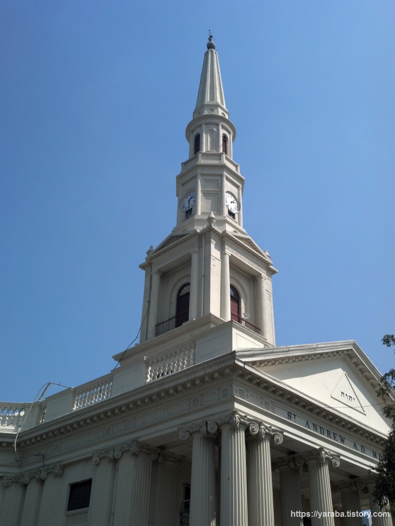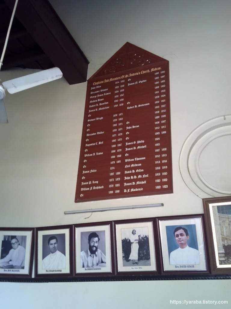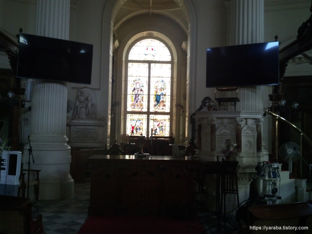 성 앤드류 교회는 1821년에 신고전주의 양식으로 세워진 스코트랜드 공동체를 위한 교회로 첸나이에서 가장 오래되고 아름다운 교회 중의 하나라고 한다. 내부는 위의 그림처럼 16개의 코린트식 기둥 위로 돔 천장이 있는 원형 예배당이다. 영국 런던의 트라팔가 광장에 있는 세인트 마틴 인더 필즈(St Martin-in-the-Fields) 교회를 본떠서 지었다고 한다. 200년이란 세월을 보낸 오래된 교회이기는 하지만 여전히 장로 교회 전통에 따라 예배가 드려지고 있다고 한다. 전면 기둥에 배치된 LCD 스크린을 보니 요즘도 예배가 드려지고 있음을 실감할 수 있다.