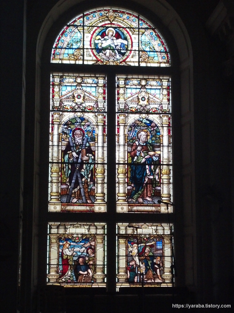 오후의 햇살을 받아 아름다운 색을 표현하고 있는 스테인드글라스. 성 앤드류는 예수님의 열두 제자중의 하나인 안드레를 말하는데 바로 베드로의 동생이다. 안드레가 러시아에 처음으로 복음을 전했다고 하는데 안드레도 십자가에 달려 순교했는데 좌측 상단 스테인드글라스에 표현된 것처럼 X자형 십자가에 처형당했다고 한다. 스코틀랜드 국기를 보면 푸른 바탕에 흰색 X자 형상을 하고 있는데 바로 안드레가 처형된 X자형 십자가를 의미한다고 한다. 스코틀랜드와 영국과의 전쟁 당시 푸른 하늘에 안드레의 X자형 십자가 모양이 나타난 이후 승기를 잡은 것이 계기가 되었다고 한다.