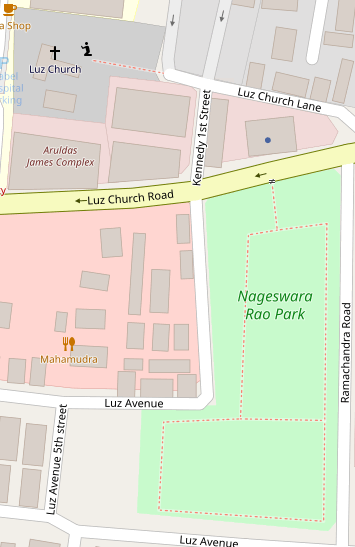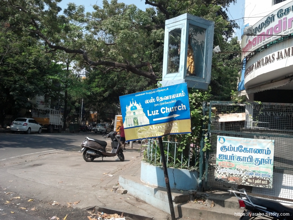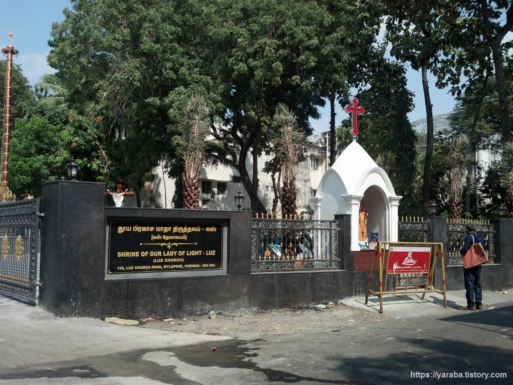 루스 교회는 1516년에 세워져 500년이 넘는 역사를 가진 로마 가톨릭 성당으로 첸나이에서 가장 오래된 서양식 건물일 뿐만 아니라 인도에서 가장 오래된 성당 중 하나라고 한다. 바로크 양식의 포르투갈 성당으로 보통은 하얀색 바탕에 전면 중앙 부분을 파란색으로 칠해 놓는데 공사 중인 모양이었다. 바닥에도 빛을 의미하는 포르투갈어인 LUZ를 새겨 놓았다.