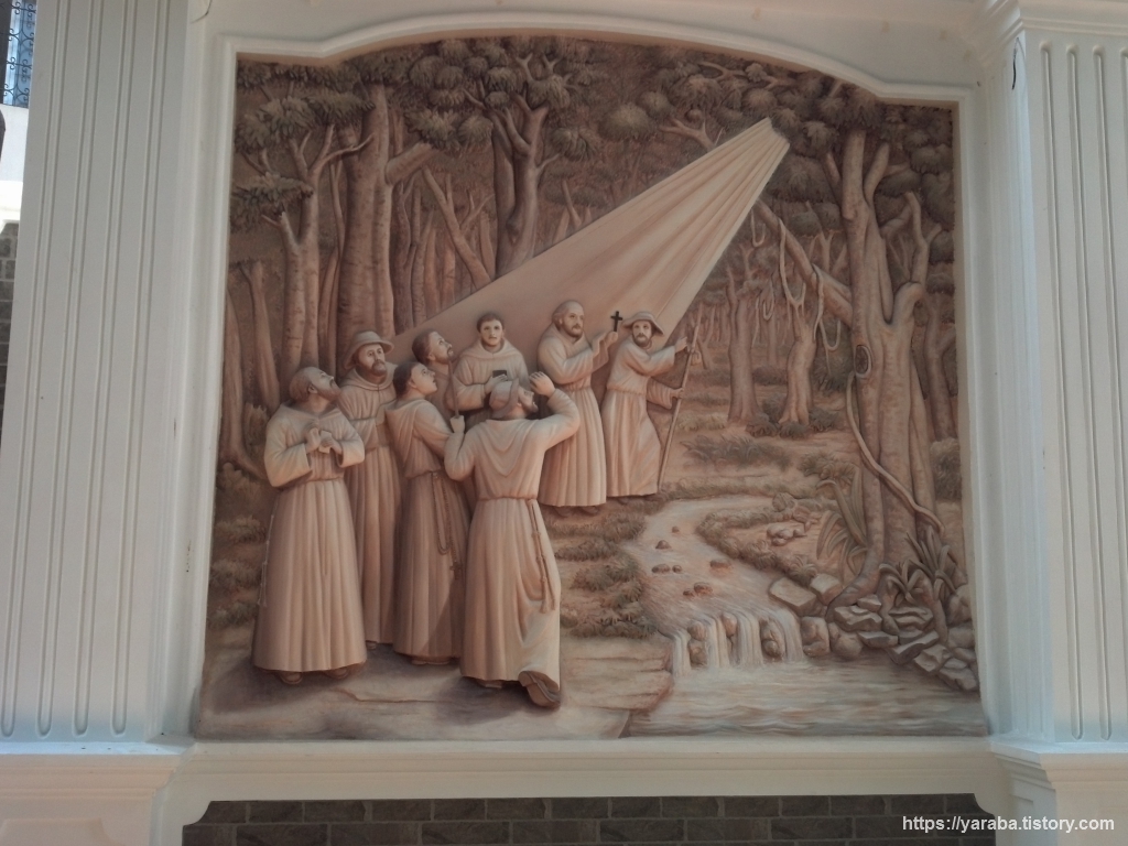 십자가의 그리스도라면 보통은 두 손과 두발이 못 박힌 상태로 표현하기 마련인데 이곳의 그리스도는 두 손을 들고 있는 특이한 모습으로 표현하고 있었다.