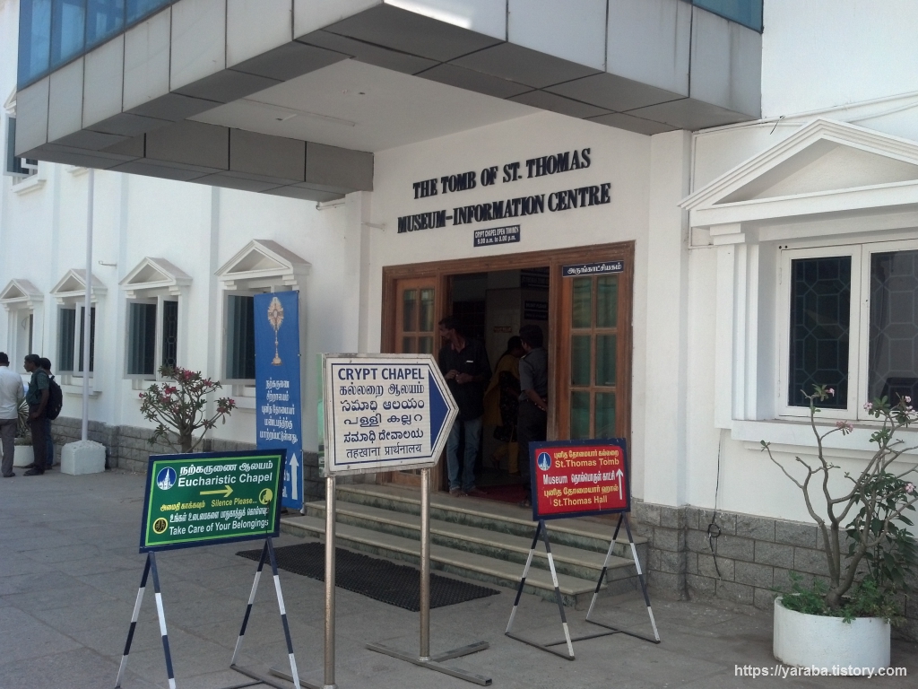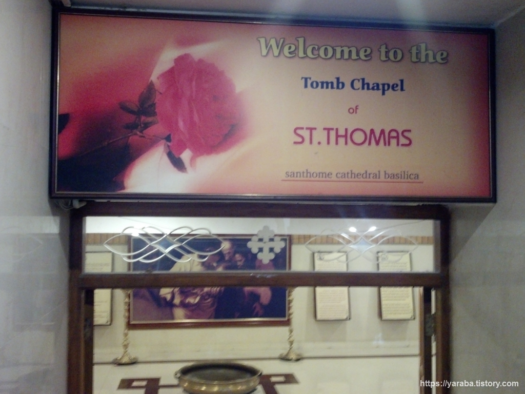 성당 뒤에 위치한 성 도마 무덤(St Thomas Tomb). 사실 도마 사도의 무덤이 먼저이고 그 위에 성당을 세운 것이다. 신발을 벗고 들어가야 한다. 1층에서는 도마 사도와 관련된 물품들을 전시하고 있는 박물관이고, 지하는 예배당이었다. 도마의 유품들은 대부분 이탈리아로 가져갔지만 작은 공간에서 뼛조각 일부와 그를 죽일 때 사용했다는 창 머리 등을 전시하고 있었다. 우리가 이곳을 방문한 시각이 11시 내외였는데 한창 미사가 진행되고 있었다. 매일 오전 11시에(일요일은 오후 5:30에 영어 미사) 도마 무덤 채플에서 현지인들을 위해 타밀어로 미사가 열린다고 한다. 지하로 내려가 보니 예배당을 현지인들이 꽉 채우고 있었다. 첸나이를 비롯한 남인도의 높은 기독교 비율을 실감하는 순간이었다. 다만, 여전히 카스트 상층부 사람들에게 기독교는 요원한 상태라고 한다.