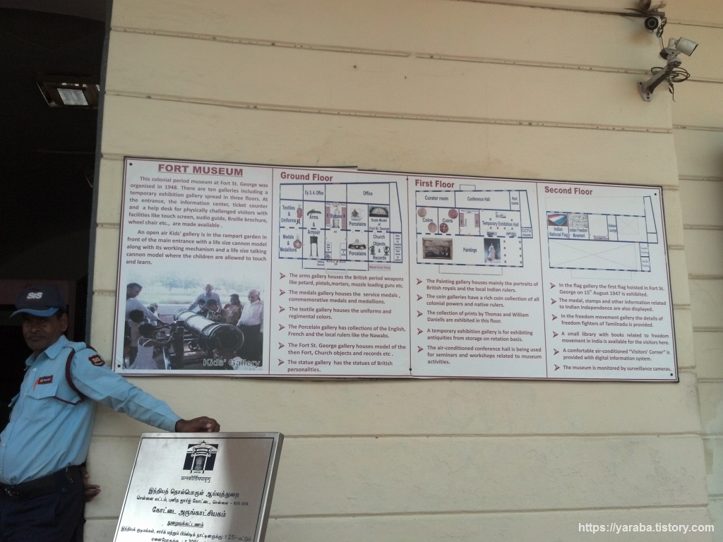 성 조지 요새로 들어오는 통로에서 바라본 우측의 요새 박물관의 모습. 좌측으로는 인도에서 가장 오래된 영국식 교회라는 1680년도에 세워진 성 마리 교회(St Mary's Church)도 있는데 이 교회에서 동인도회사 초대 총독이었던 로버트 클라이브(Robert Clive)와 예일 대학교가 세워지는데 기여한 엘리후 예일(Elihu Yale)이 결혼했다고 한다. 요새로 들어오는 통로라면 보통 해자를 가로지르는 다리를 지나기 마련인데 그런 흔적을 찾기는 어려웠고 요새 주변으로 배치되어 있는 대포가 이곳이 요새였음을 말해 주고 있다.