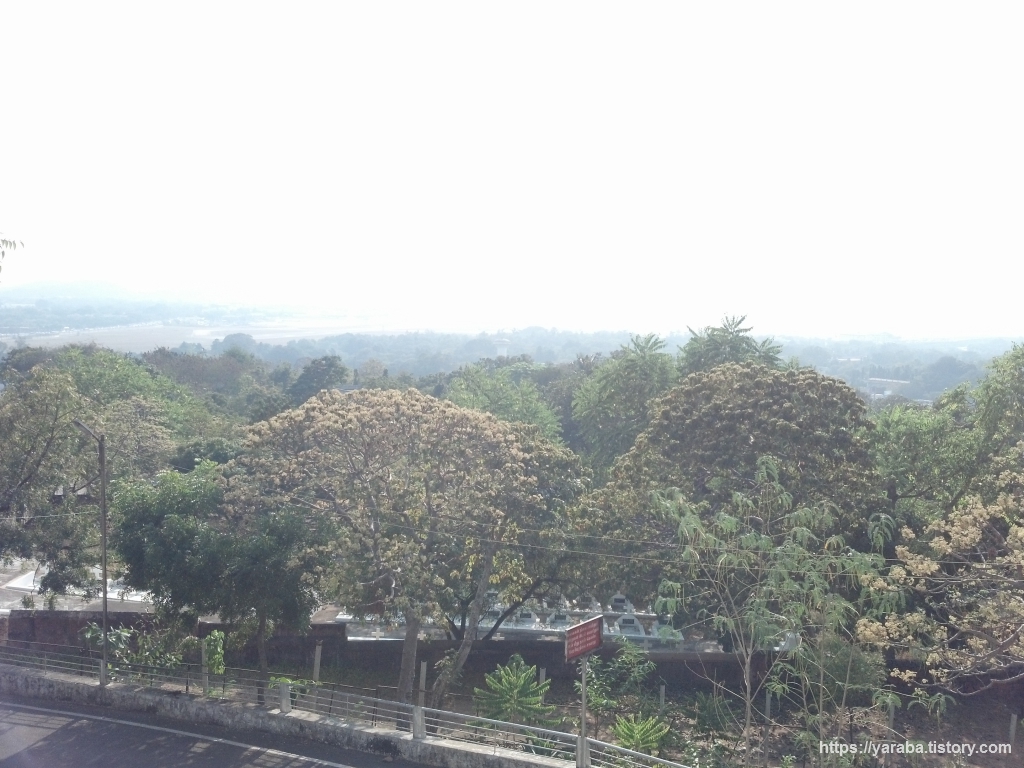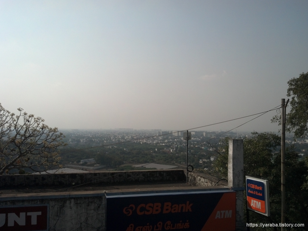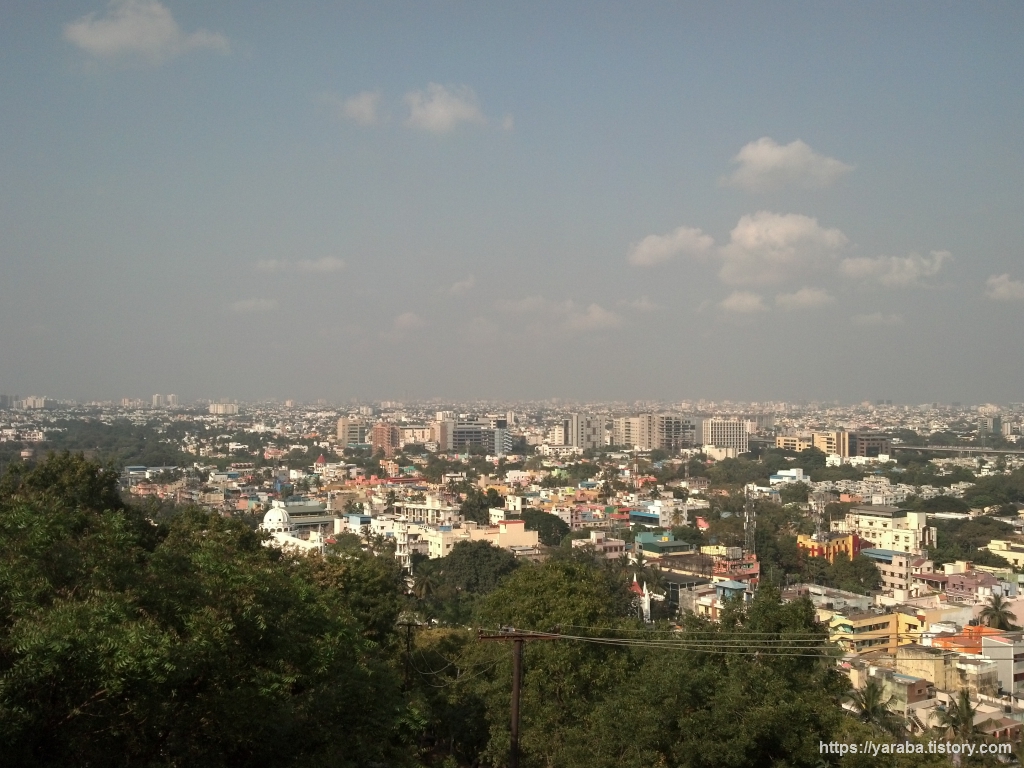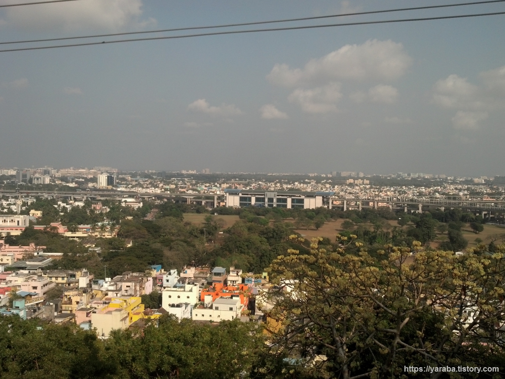 성 도마 산에서 남동쪽을 바라본 모습. 멀리 성 도마 산(St. Thomas Mount) 기차역도 보인다. 메트로와 연결되는 역이기도 하다. 역사 뒤로 보이는 녹지대는 열대 우림이라는 긴디 국립공원(Guindy National Park)이 아닌가 싶다.