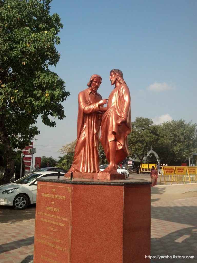 리틀 마운트 교회에 걸려있는 그림에서는 예수님의 창 자국을 만지는 시늉을 하는 도마를 그렸더니만 이곳에서는 아예 조각상으로 세워 놓았다. 예수님의 부활을 믿지 못했던 도마 앞에 나타나셔서 "믿는 자가 되라고"하신 예수님의 말씀에 과연 도마는 저런 시늉을 했을까? 하는 의문을 가질 수밖에 없다. 교회 입구에 붙여 놓은 것처럼 "나의 주시며 나의 하나님이시니이다"라고 고백하던 도마 사도는 그저 무릎을 꿇고 얼굴을 땅에 대지 않았을까? 하는 상상을 해본다. 조각상 뒤로 성당 안쪽까지 들어온 관광객들의 차량이 보인다. 종교에 상관없이 많은 이들이 방문하는 장소이다 보니 성당 관계자들은 이곳저곳에서 호루라기를 불어대며 사람들 통제하기에 여념이 없다.
