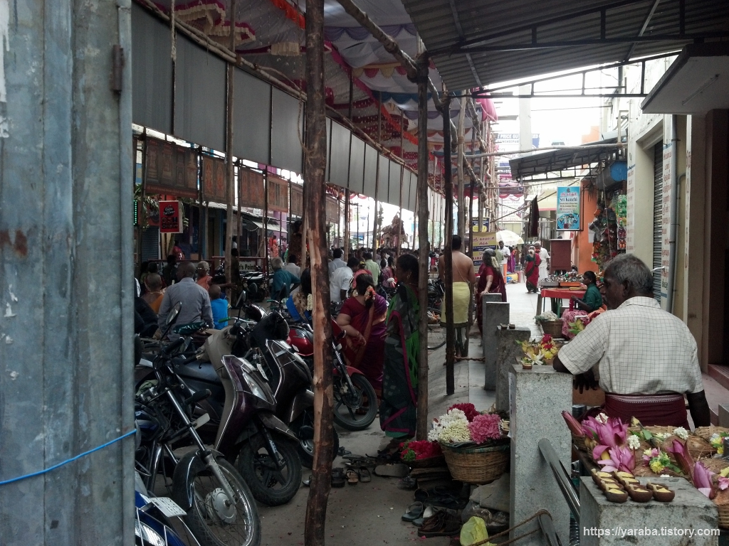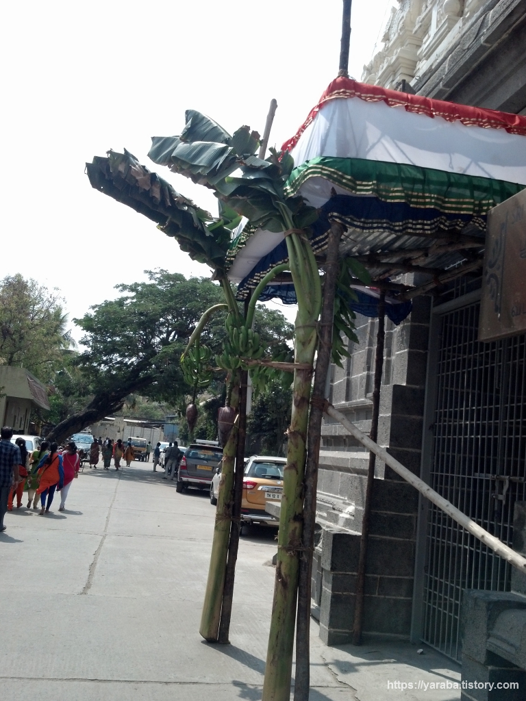 사원 방문을 끝내고 나왔는데 평일임에도 불구하고 수많은 사람들이 사원을 향하고 있었다. 사원을 나오면서 만나는 현지인들 중에는 삭발한 사람들이 적지 않았는데 머리를 깎는 것에 얽힌 이야기가 있었다. 힌두 신자들은 사원에 가서 머리카락을 잘라서 신에 바치는 행위가 자신을 드린것과 같다고 여기거나, 감사의 의미로 머리카락을 잘라서 바친다고 한다. 그런데, 이렇게 머리카락을 바치는 사람들이 많다 보니 큰 사원들은 머리를 전문적으로 깎는 사람들을 두고 줄을 서서 머리카락을 바치는 사람들을 소화시킨다고 한다. 그리고 그 머리카락을 팔아 상당한 수입을 올린다고 하니 우리네 어머니들이 힘든 살림에 자신의 머리카락을 잘랐던 사연과는 전혀 다른 이야기이다. 아무튼 사원을 나와서 동쪽 입구를 지나는데 입구 장식이 독특했다. 바나나 나무를 통째로 잘라서 기둥에 묶어 놓았고 입구 위에는 인도 국기를 연상시키는 천 장식을 해 놓았다.