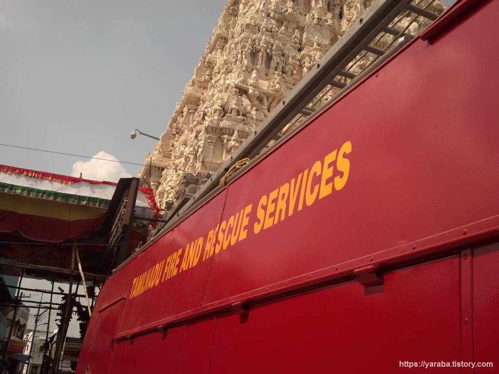 사원 입구는 시장과 연결되어 있었는데 때마침 힌두 승려, 인형을 들고 있는 사람들이 포함된 행진이 있었다. 통상 힌두 축제가 열리면 악마 인형을 태우는 등의 퍼포먼스가 있다고 하는데 이 때문인지 입구에는 소방차가 대기하고 있었다.