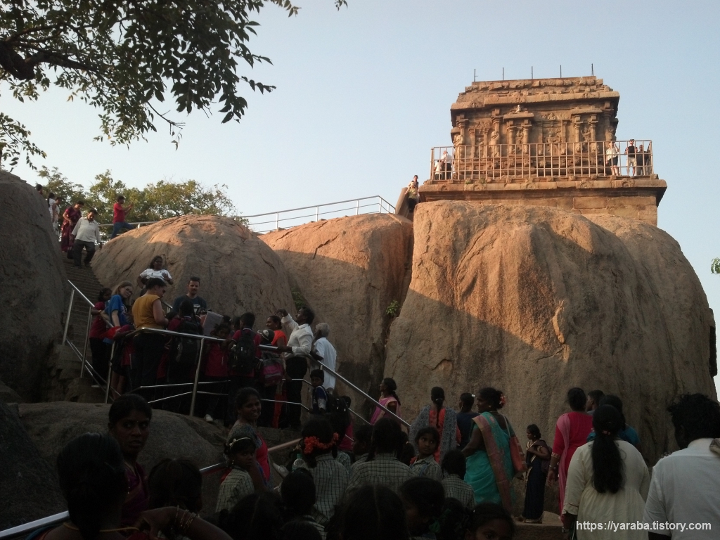 첫 번째 목적지는 이스와라 사원(Iswara Temple at Mamallapuram)으로 바위를 깎아 만든 계단을 통해서 올라가야 하기 때문에 사람이 많은 경우 그 줄을 따라 올라가는 것이 만만치 않았다. 토요일 오후라 사람이 많기는 했지만 올라간 사람들이 오래 머물지 않아서 그런지 많이 기다리지 않고 올라갈 수 있었다.