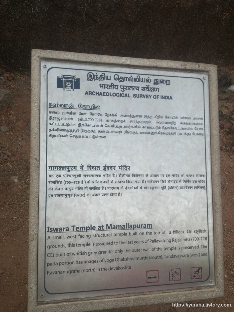 이스와라 사원(Iswara Temple at Mamallapuram)은 8세기에 팔라바 왕조에 의해 지어진 것으로 계단을 통해 꼭대기까지 오르면 막힘없는 주변 전경을 마음껏 볼 수 있다.