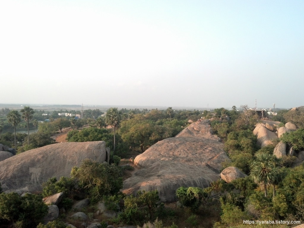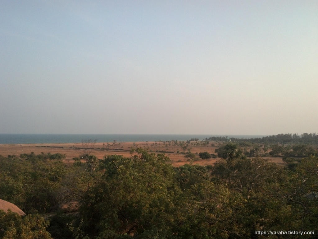 바위산에 올라 바라본 벵골만 쪽 바다의 모습과 남쪽의 모습이다. 나중에 알고 보니 이곳에서 남쪽으로 몇킬로미터 떨어지지 않은 장소에 원자력 발전소가 가동 중이라 보안 상 사진을 찍으면 안 된다고 하는 이야기가 있기도 했다. 물론 시야에 핵발전소가 보이지는 않았고 남쪽으로 길게 이어진 버킹엄 운하와 소금 호수뿐이었다. 인도는 22기의 원전으로 한국 다음으로 원전을 많이 보유하고 있는 나라이고 비공식 핵무기 보유국이기도 하다. 첸나이가 속해 있는 타밀나두 주에도 마드라스 핵발전소가 위치하고 있다. 핵발전소가 많기는 하지만 워낙 큰 나라이고 인구가 많다 보니 원자력 발전이 차지하는 비중은 아주 낮은 편이다.