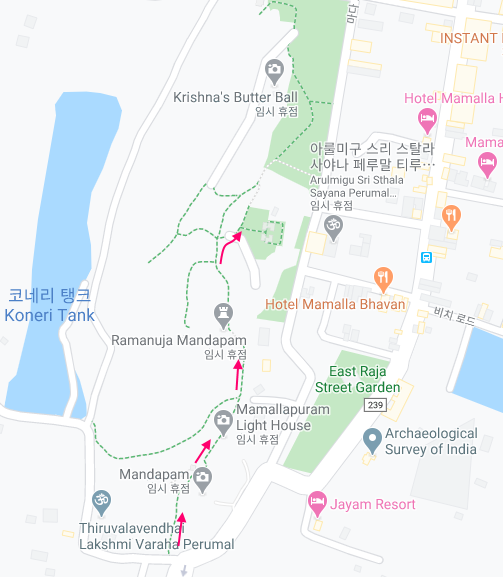 마하발리푸람(Mahabalipuram)은 첸나이에서 남쪽으로 60km 정도 떨어진 도시로 해안 사원을 비롯해서 바위를 깎아 만든 사원 등 여러 유적들이 유네스코 세계 유산으로 지정되어 있다. 우리는 해안 사원은 입장료도 비싸고 그리 볼만하지 않다는 의견에 따라 바위 산을 따라 남겨진 유적들을 보기로 했다. 7~8세기 팔라바(Pallava) 왕조 만들어진 힌두교 사원들이다. 위의 지도에서 처럼 가장 남쪽에서 시작하여 높지 않은 산 능선을 따라 북쪽으로 이동하는 방식이다. 우측은 벵골만의 바다가 위치하고 있고 좌측은 내륙이지만 버킹엄 운하(Buckingham Canal)가 첸나이 북쪽까지 총 796Km가 이어져 있는 독특한 지형을 가지고 있는 곳이다. 운하와 함께 커다란 호수가 있어서 마치 기다란 섬 같은 모습을 가지고 있다.