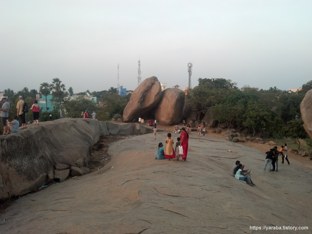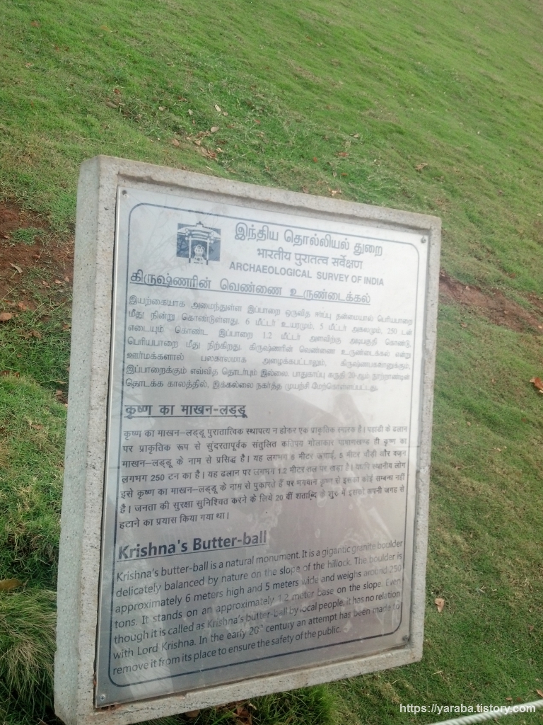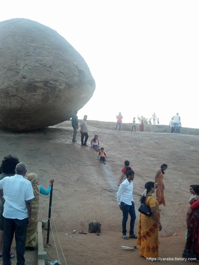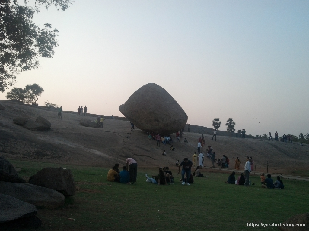 언덕을 내려와 평지에 이르면 유적지의 북쪽 출입문에 이르게 되는데 이곳에서 마하발리푸람의 대표적인 상징물인 크리슈나의 버터볼(Krishna's Butterball)을 만날 수 있다. 워낙 많은 사람들이 다녀 가면서 미끄럼을 타서 그런지 바위가 반들반들하니 자연 미끄럼틀이 되었다.