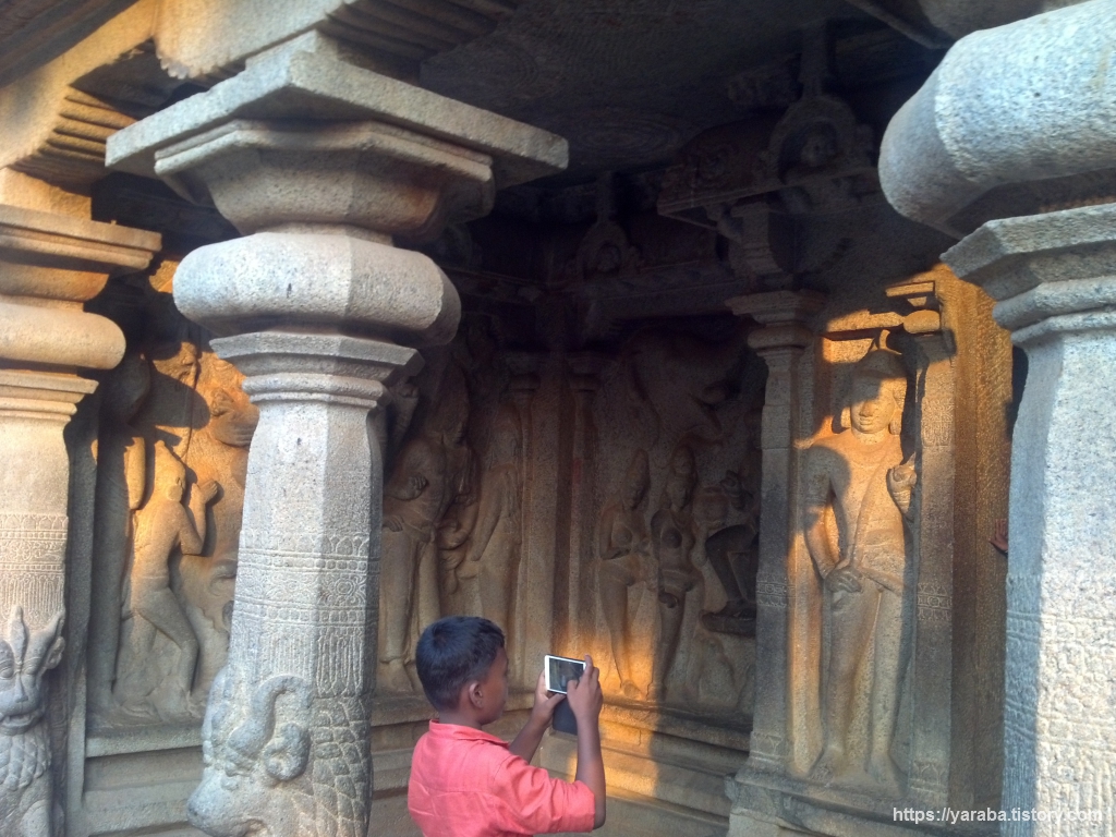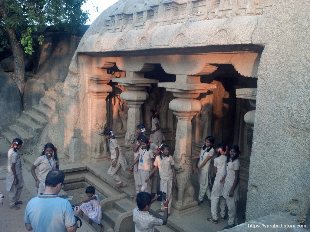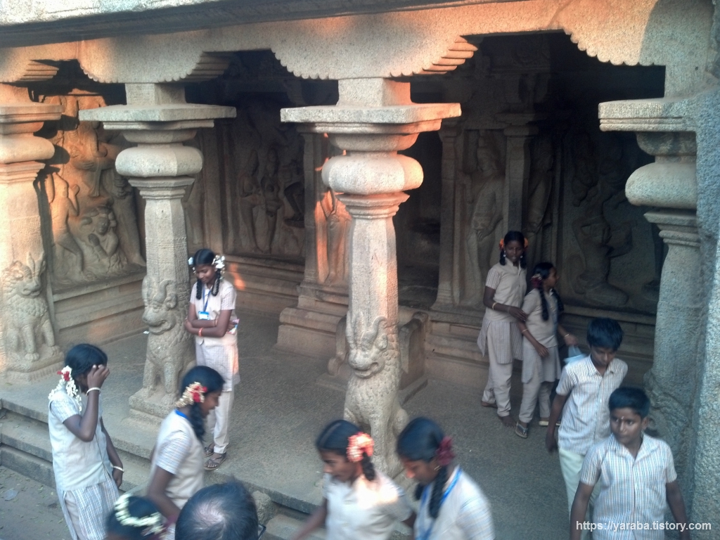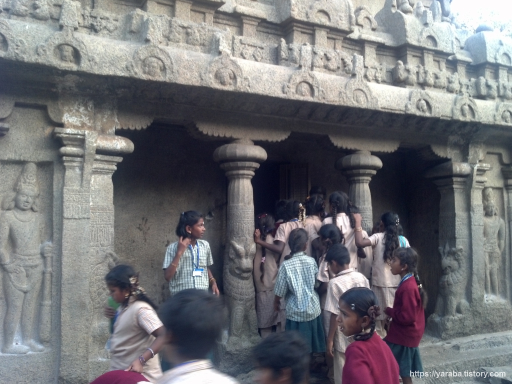 바라하 동굴 사원(Varaha Cave Temple)에 도착했다. 여기도 바위를 깎아 만든 사원으로 마하발리푸람에서 유일하게 아침, 저녁으로 의식이 열리는 장소라고 한다. 발랄한 인도 학생들이 사원을 가득 채웠다. 어릴 적 소풍이라고는 서울 주변의 왕릉을 가는 것이 전부였는데 이곳 아이들도 비슷한가 보다. 7세기 발라바 왕조에 의해 세워졌다.