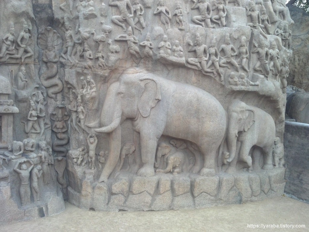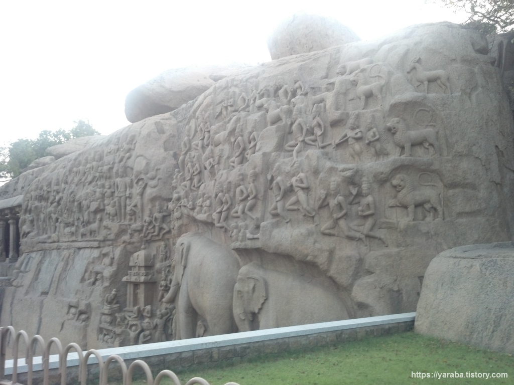 폭 29미커, 높이 13미터에 이르는 거대한 조각으로 두 덩이의 바위를 깎아서 만들었다고 한다. 7세기경 팔라바 왕조에 의해서 제작된 작품으로 하늘에 있던 갠지스강이 시바신의 몸을 타고 땅으로 내려온 사건을 묘사한 것이다. 4대 문명의 발상지이기도 한 갠지스강은 히말라야에서 발원하여 인도 북부를 동쪽으로 흐르다가 벵골만으로 흘러드는 약 2,600Km의 강으로 힌두교 신자들에게 영험한 강으로 믿어지고 있기 때문에 이 강에서 목욕하는 것으로 영혼을 정화시킨다고 하지만 오염 때문에 이 강에서 목욕하는 상당수가 피부병이나 풍토병에 걸린다고 한다. 2007년에는 심한 오염에 상류에 건설된 댐 때문에 그 오염이 극심해지자 힌두 승려들이 집단으로 자살하겠다는 협박을 했고 댐의 방류량을 늘려야 했다는 사건도 있었다.