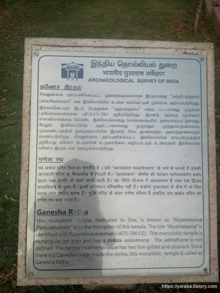 바라하 동굴 사원(Varaha Cave Temple)을 지나 언덕을 내려오면 가네샤 라타(Ganesha Ratha)를 만나게 된다. 라타(Ratha)는 힌두교의 신들이 타는 마차 모양의 사원을 말하는데 가네샤 라타는 마하발리푸람 지역에 있는 10개의 라타 중에 하나라고 한다. 커다란 화강암 바위 하나를 깎아서 만든 것으로 7세기경에 제작된 것이다. 코끼리 머리를 가진 가네샤를 기리는 사원으로 가네샤는 시바의 아들로 지혜의 신이자 채식주의의 신이라 한다.