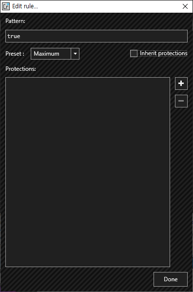 설정은 각 개별 파일에 할 수도 있지만 <Global settings>를 선택하고 [+]클릭하여 true를 설정한 다음에 [-] 아래에 있는 규칙 수정 버튼을 클릭해서 상세한 난독화 규칙을 적용한다. 필자의 경우에는 Preset을 Maximum으로 설정해서 최대한 난독화 하도록 설정했다. 전체 규칙을 적용하면 물론 속도는 상당히 떨어질 것이다.(필자의 경우 압축을 적용했더니 바이러스가 검출되어서 압축은 사용하지 않았다)
