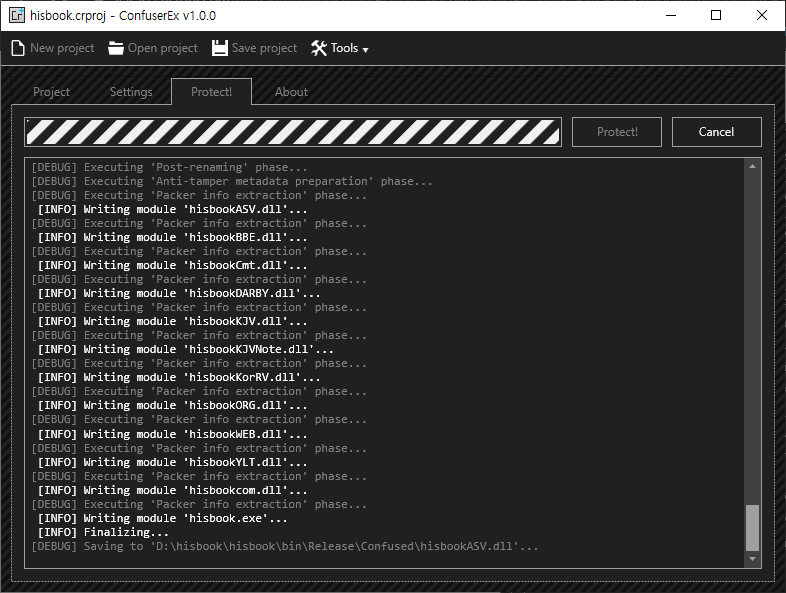 모든 준비가 끝나면 Protect! 탭으로 이동하여 [Protect!] 버튼을 클릭하여 난독화 작업을 진행한다. 좌측의 그림을 보면 각 모듈 단위로 지정한 규칙들이 모두 적용되고 있음을 확인할 수 있다.