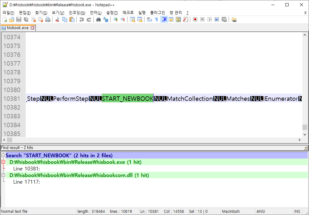 디컴파일을 통해서 소스코드를 복원할 수 있다는 것은 굳이 디컴파일 과정을 직접 거치지 않더라도 간접적으로 확인할 수 있다. 위의 그림은 소스 코드에 있는 특정 변수명을 검색할 것으로 실행 프로그램과 DLL 라이브러리에서 모두 검색되는 것을 볼 수 있다. 즉, 디컴파일 도구가 거의 원본 소스 코드 수준으로 복원할 수 도 있다는 것을 간접적으로도 확인할 수 있는 것이다. 물론 주석이나 코딩 스타일과 같은 부분까지 복원되지는 않는다. 이런 정보는 컴파일 과정에서 모든 제외되기 때문이다. 그러나, 프로그램의 가독성을 위해서 변수명, 클래스명, 오브젝트명 등을 의미 있는 것으로 붙이기 때문에 주석이 없더라도 코드는 충분히 참고할만하고 읽고, 수정이 가능한 것이다.