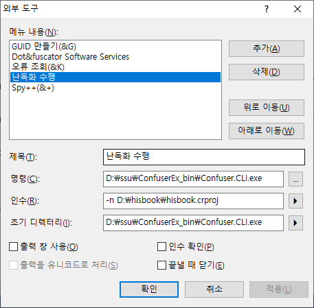 끝으로 이 난독화 과정을 프로젝트에 포함시키려면 프로젝트 빌드 시점에 수행하도록 빌드후 이벤트로 등록하는 방법이 있고, 위의 그림과 같이 비주얼스튜디오>도구>외부도구에서 난독화 과정을 수행하는 메뉴를 추가해서 사용하는 방법이 있다. 필자의 경우에는 후자로 수행했다. 내가 오랜 시간 공들여서 제작한 프로그램을 오픈 소스 프로젝트로 만들고 싶다면 빌드한 상태로 배포하면 되고 그렇지 않다면 난독화 과정을 거치는 것을 추천한다.